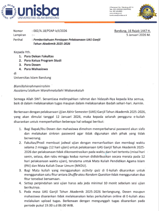 Diinformasikan kepada seluruh mahasiswa Unisba agar mengisi Kuesioner Proses Pembelajaran dan Proses Layanan untuk Semester Ganjil Tahun Akademik 2025/2026 sebelum mengikuti Ujian Akhir Semester untuk Cetak Kartu Ujian.